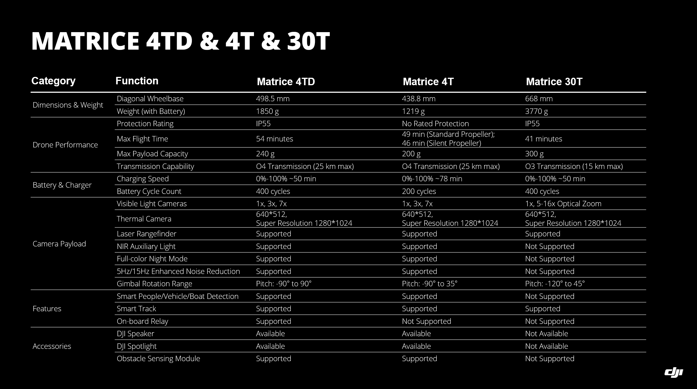 | Thermal Camera | Identical core functionality and resolution to M30T | Identical core functionality and resolution to M4TD |